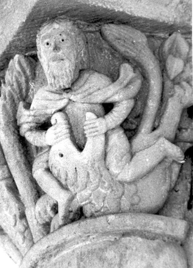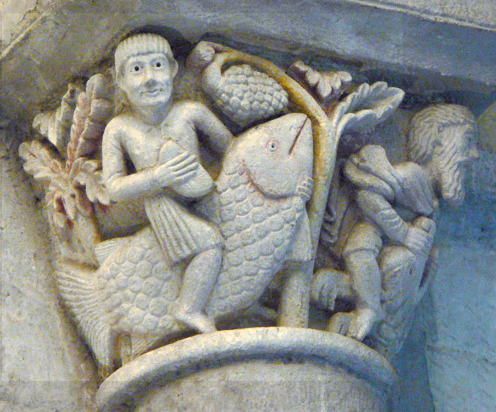 Ce chapiteau situé sur le mur nord présente 2 scènes bibliques. Tobie est accompagné par l'archange Raphaêl en chemin. Passant le long du fleuve, un poisson saute hors de l'eau. L'archange dit à Tobie de l'attraper et lui explique comment guérir la cécité de son père en utilisant les entrailles du poisson. La scène représente le moment où Tobie attrape le poisson. Sur l'autre côté, Samson et le lion.(photo de Matthieu Perona publiée dans Wikipedia)