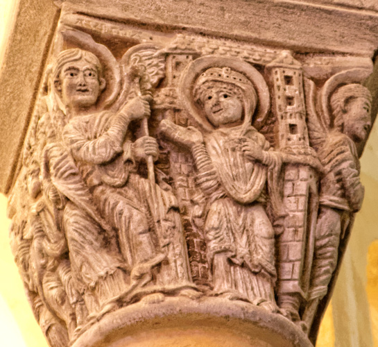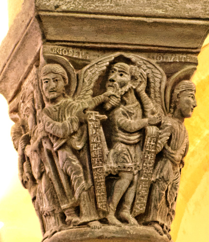 Ce chapiteau est consacré à la Vierge Marie, considérée comme la Nouvelle Eve. La scène ci-dessus représente l'Annonciation. Dans un édifice à plusieurs étages, vêtue d'un vêtement assez élaboré, la Vierge écoute avec dévotion l' Ange venu lui annoncer la nouvelle.