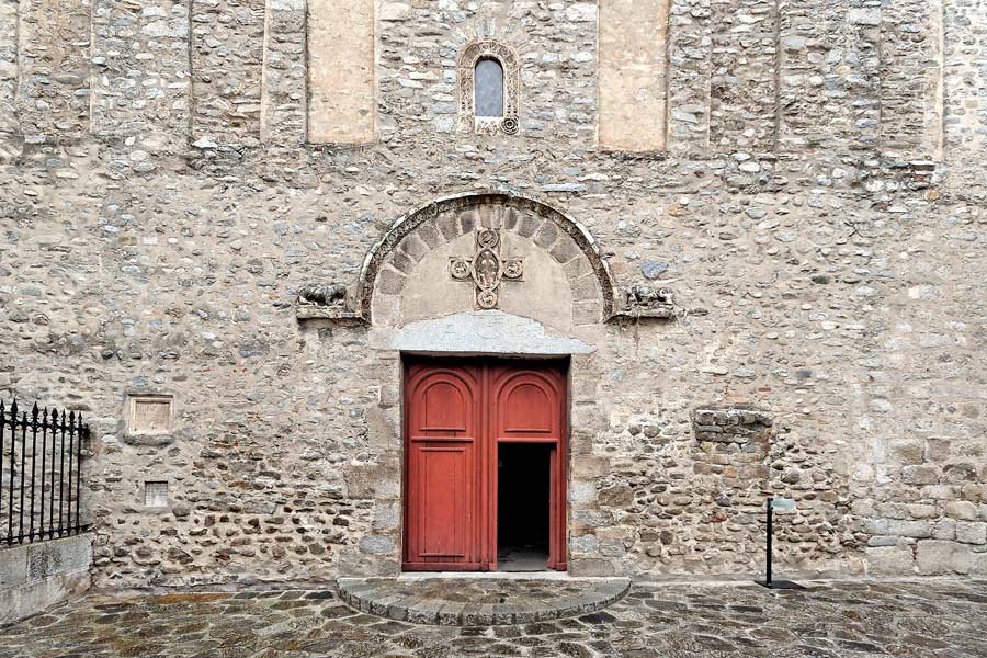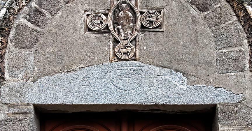 Le linteau monolithe a une forme inusitée dans la région, probable réemploi de l'église pré-romane. Un demi cercle gravé enserre une croix flanquée de Alpha et Oméga. De chaque côté deux lettres A, peut être pour Arles.