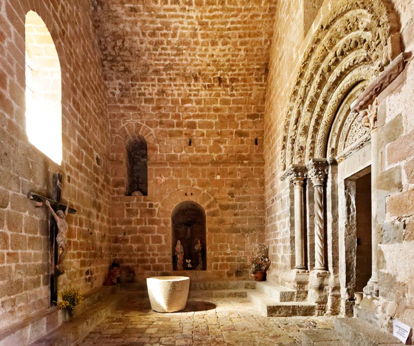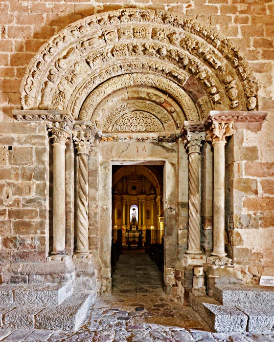 Une succession de voussures encadrent un tympan couvert de cercles entrelacés et de feuilles découpées. Deux colonnes soutiennent les voussures de chaque côté, la première lisse, la deuxième torsadée. Chacune est agrementée d'un chapiteau sculpté.