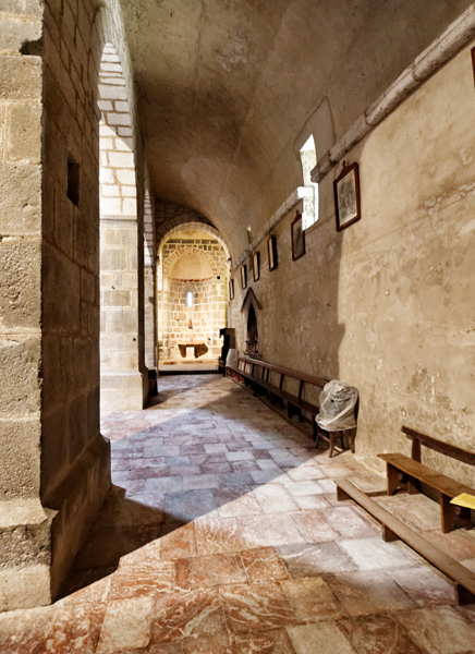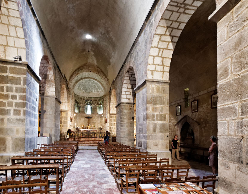 | L'église est de plan basilical à 3 vaisseaux séparés par de grandes arcades sur piliers rectangulaires. Le vaisseau central fut couvert d'un berceau brisé continu et les collatéraux d'un demi-berceau. Sur le transept s'ouvrent 5 absides semi-circulaires. Seule l'abside centrale fait saillie, les autres étant prises dans l'épaisseur du mur. |