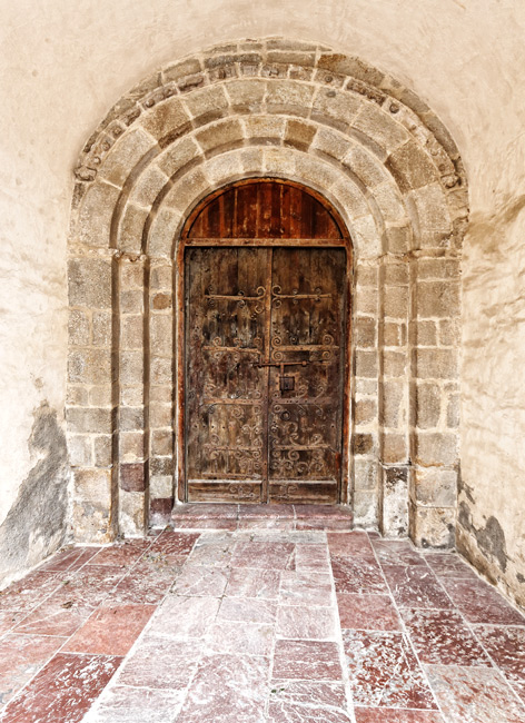 | Le portail est d'une facture très simple. Il est en granit et non pas en marbre utilisé d'habitude. Les sculptures qui l'ornent sur la voussure extérieure se sont fortement dégradées à cause de la qualité du matériau. |