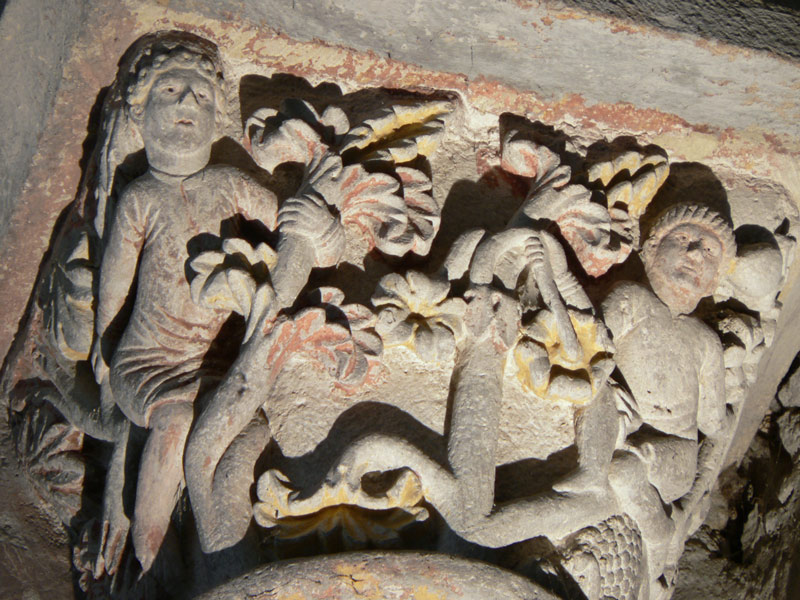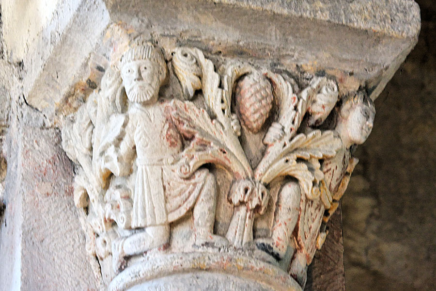 Premier pilier Ouest : 2 hommes, un genou à terre, dans des feuillages. L'un jeune, l'autre âgé.
