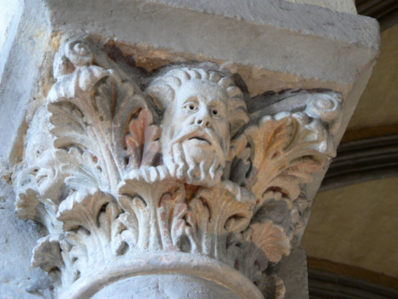 Deuxième pilier (à partir de l'ouest) : trois visages parmi les feuilles d'acanthe. (photo de Matthieu Perona)