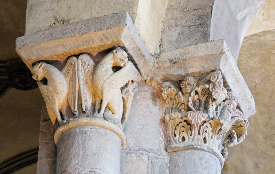 Troisième pilier : à gauche, deux chimères ou dragons (face ouest). Sur la face sud, un autre chapiteau avec des masques au milieu des feuilles.