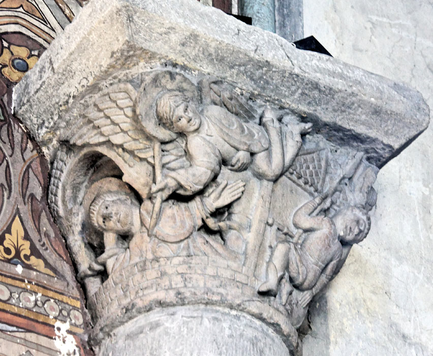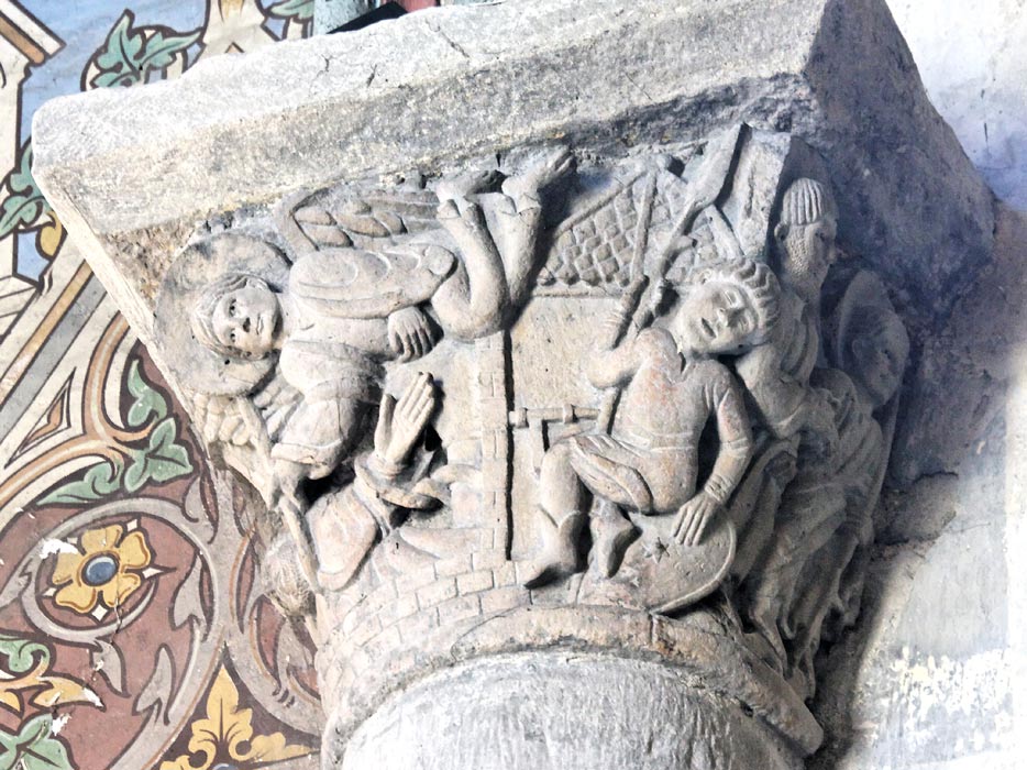 A l'entrée du choeur, sur la colonne engagée à droite, est représentée la délivrance de saint Pierre. Le roi Hérode a afit enfermer Pierre. Le saint, enchaîné, est réveillé par l'ange qui vient le délivrer. A droite, le soldat dort.