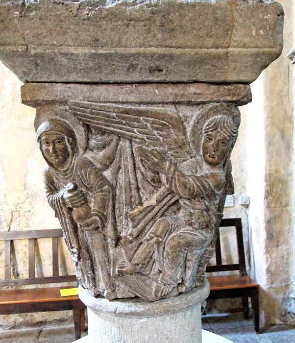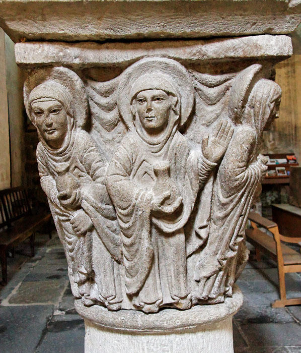 Le matin de Paques les saintes femmes se dirigent vers le tombeau du Christ. Elles portent les ampoules de parfum pour embaumer le corps de Jésus. Leurs visages sont emplis de tristesse. Cette sculpture a été effectuée par un atelier auquel on doit aussi les Atlantes, Jonas et saint Pierre. Le modelé très étudié des visages est très nouveau. Les têtes sont légèrement disproportionnées par rapport aux corps. Les yeux sont en amande. Les proportions sont étudiées pour rendre bien lisible le chapiteau, placé à 5 mètres du sol.