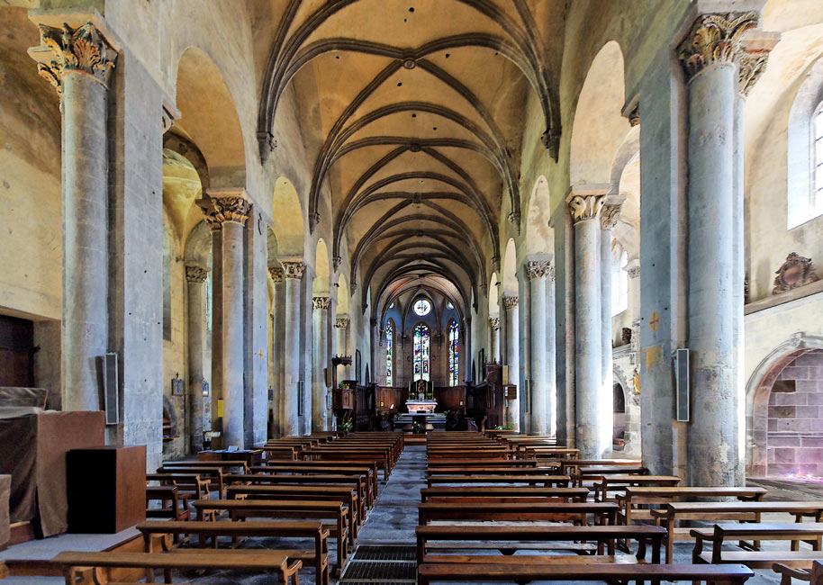 La nef comporte 6 travées. 12 piliers soutiennent l'ensemble. Ils sont consolidés par des colonnes dégagées agrémentées de beaux chapiteaux.