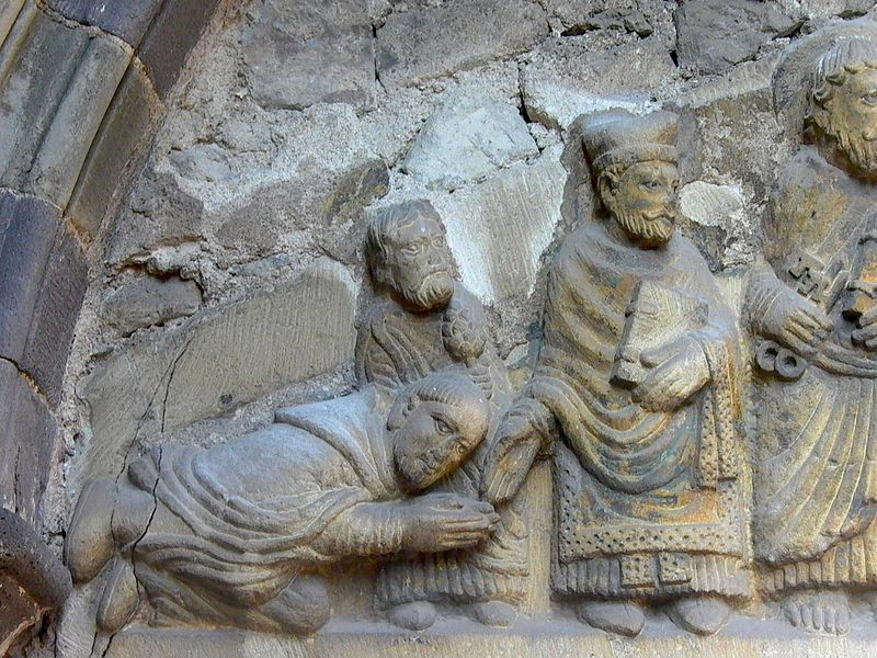 Le moine est prosterné. Il est le seul à regarder vers l'avant car il est du monde des vivants.
