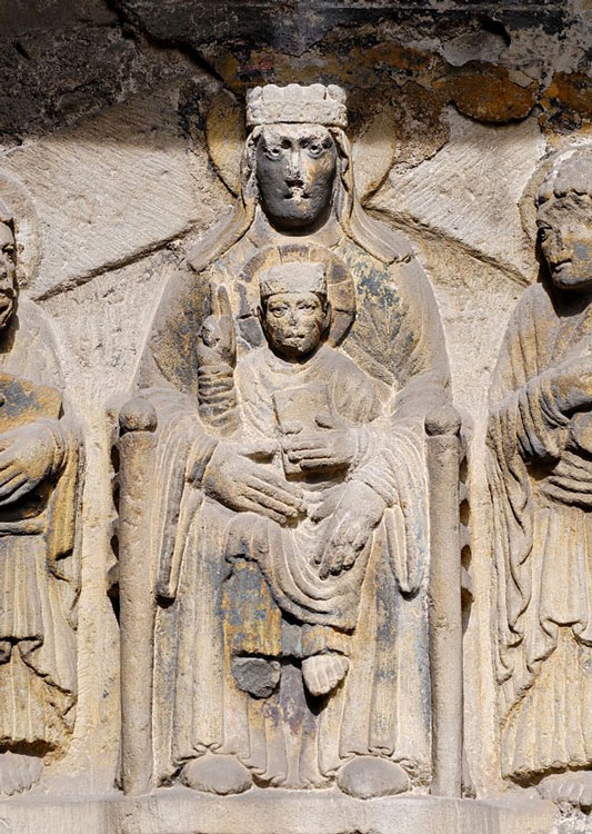 La Vierge et l'enfant sont assis sur une haute cathédre. Les doigts de la Vierge sont très longs. Jésus bénit de sa main droite et tient l'Ancien testament contre son buste avec sa main gauche.