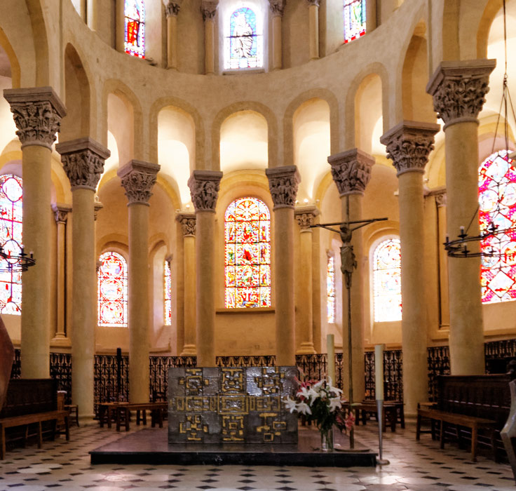 Les 8 colonnes portent 4 chapiteaux à feuillages et 4 chapiteaux historiés. Ils sont présentés ici dans l'ordre du nord (à gauche) vers le sud (à droite).
