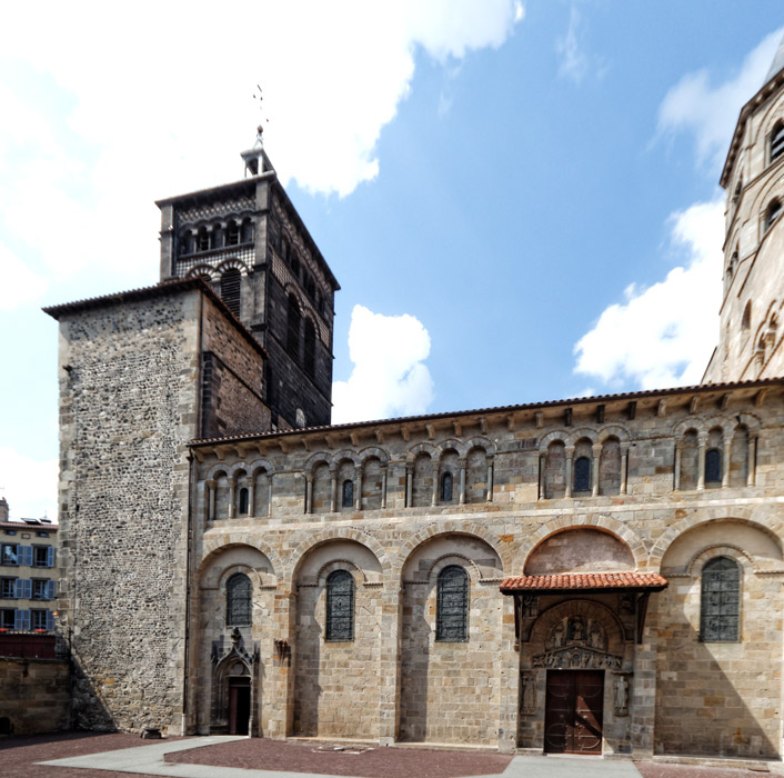 La façade latérale est divisée en 5 travées, comme la nef. Les contreforts correspondent aux piliers intérieurs. Sous le toit, se développe une série d'arcatures. le massif de gauche marque l'emplacement du narthex légérement plus large que la nef.