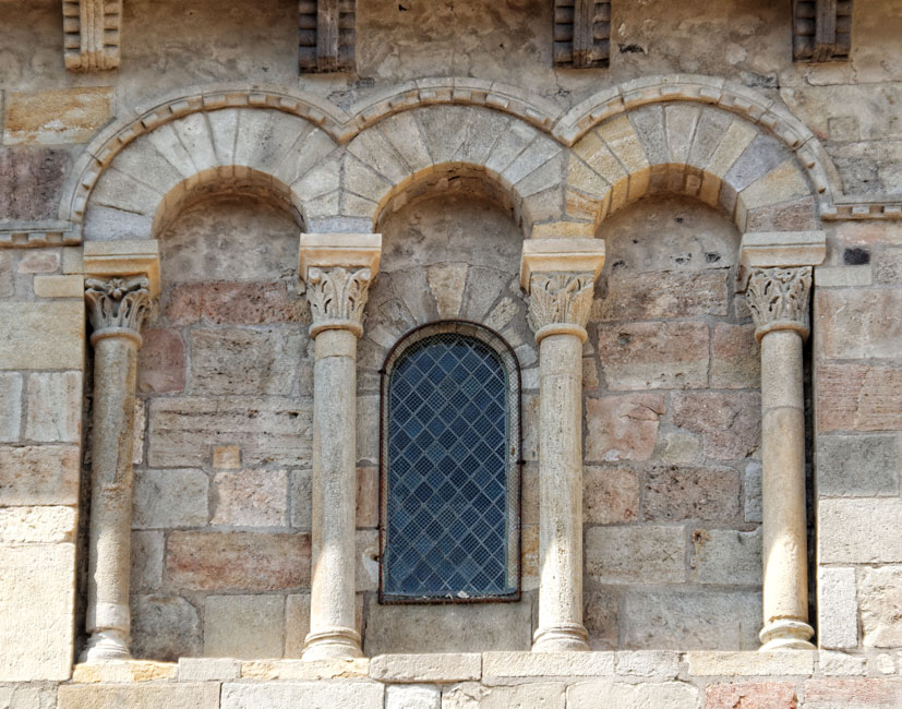 Deux des 3 arcatures sont aveugles. Les colonnes sont logées dans l'épaisseur du mur.