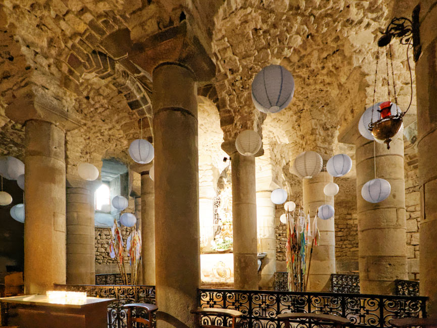Le plan de cette crypte est celui de l'étage supérieur : huit colonnes sans chapiteaux correspondent aux colonnes du rond-point.