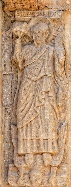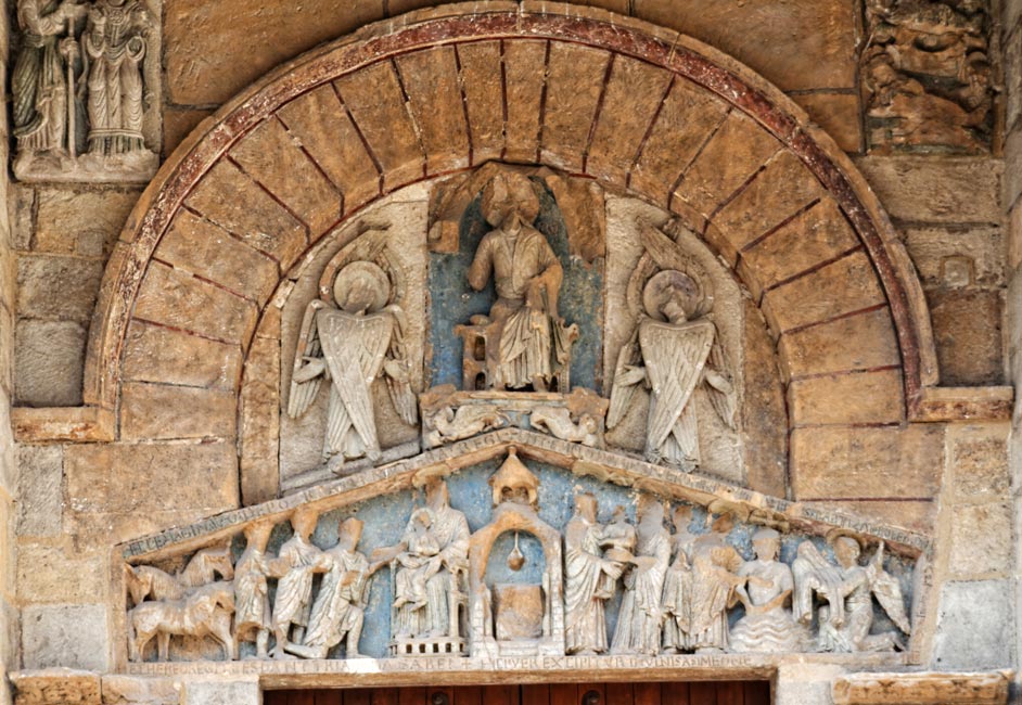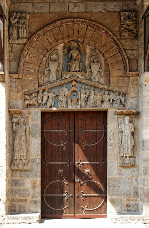Au dessus d'un linteau en bâtiére, le tympan représente la vision d'Isaie voyant le Seigneur entouré de séraphins. Les séraphins ont 6 ailes, dont 2 leur servent pour voler et les autres pour se couvrir la face et les pieds. Le Seigneur est identifié au Christ. Il est entouré des animaux mystérieux de la vision d'Ezéchiel qui ont été par la suite identifiés aux 4 évangélistes. On reconnait encore le boeuf de saint Luc et le lion de saint Marc.