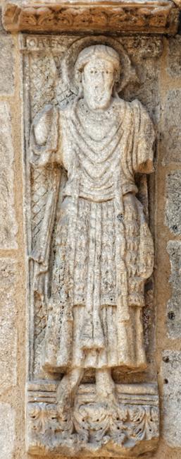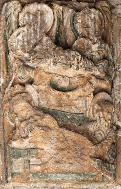 En dessous, le linteau en bâtiére contient 3 scènes : l'adoration des Mages, la Présentation au temple et le baptême du Christ. A gauche, les chevaux des mages. A droite, un ange agenouillé.