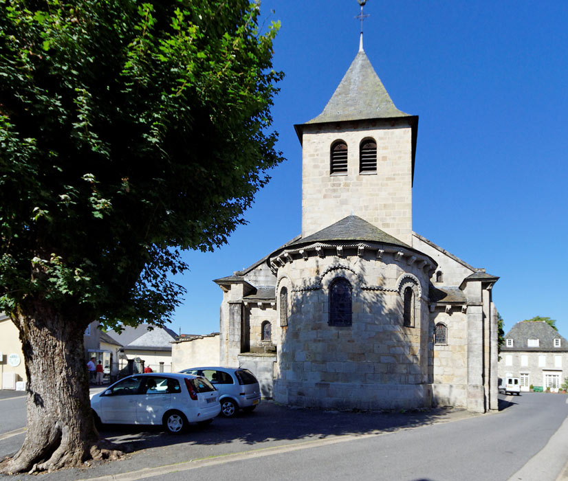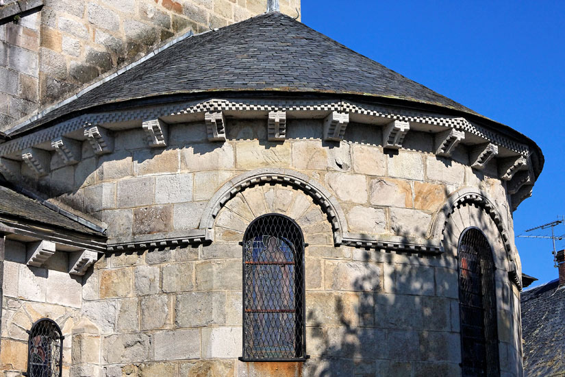La corniche de l'abside est décorée d'un damier récent. de même que les modillons ici uniformément à copeaux. Également récent le cordon de billettes qui court tout autour.