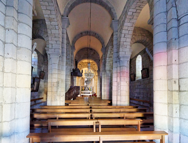 La nef est flanquée de 2 collatéraux. L'ensemble est divisé en 4 travées. Deux rangées de 5 piliers carrés flanqués de colonnes engagées soutiennent la voûte. Ils comportent des chapiteaux sculptés parmi lesquels des motifs religieux.