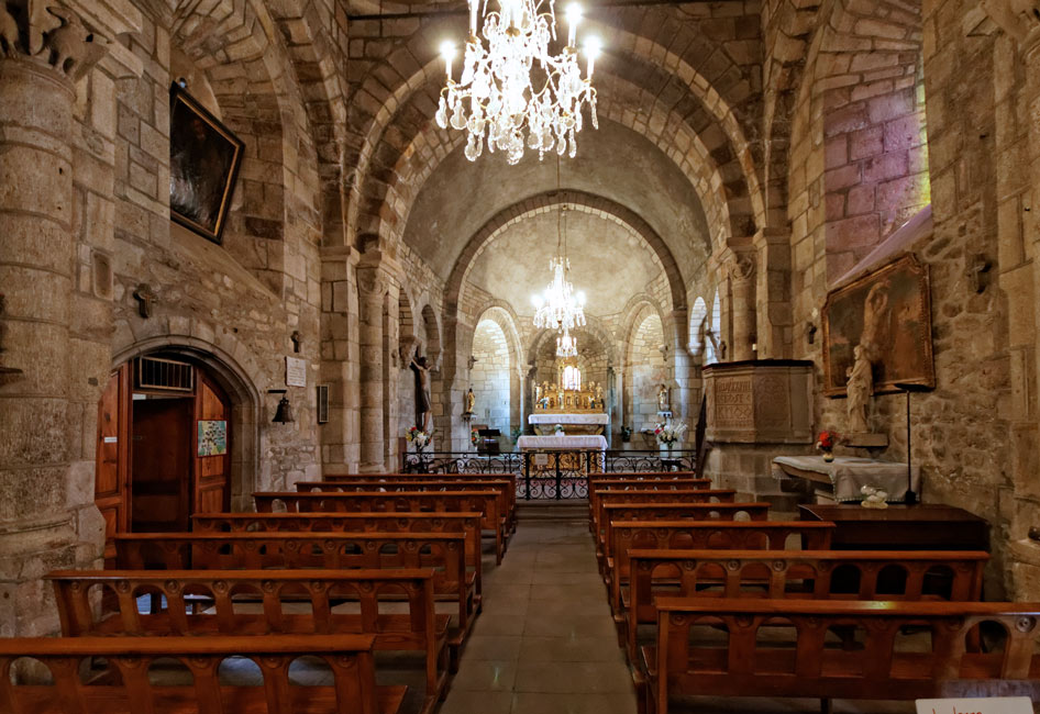 La nef est constituée de 4 travées. C'est un véritable petit musée avec de nombreuses statues dont l'admirable Notre-Dame du Portail (à droite, XVème siècle)), une chaire sculptée et un Christ roman. Les arcs de souténement retombent sur des piliers ornés de colonnes engagées avec des chapiteaux sculptés. Une chapelle a été rajoutée au XVème siècle.