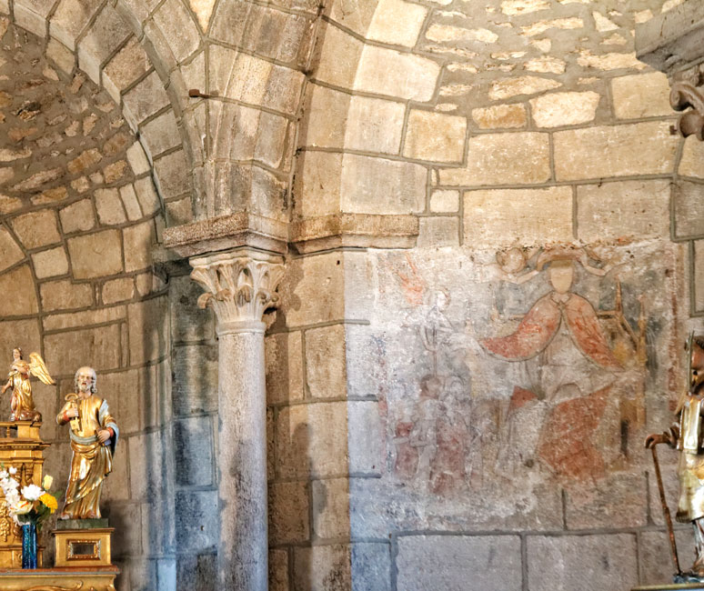 A droite, une peinture du XIVème ou XVIème siècle à demi disparue représente un couronnement d'un chanoine ou chanoinesse (?) par 2 anges devant una assemblée de fidéles.