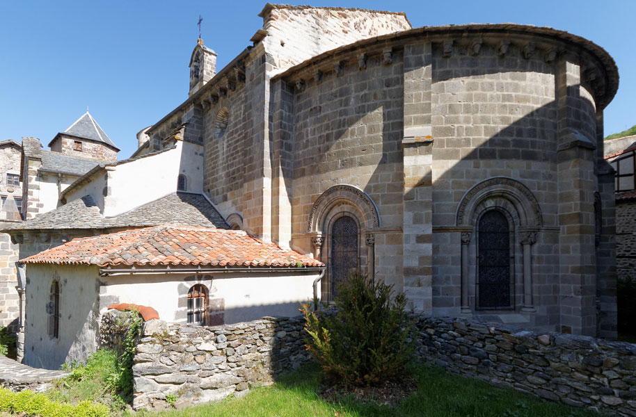 A gauche, derrière la maison au toit de tuiles rouges, on peut voir les toits en ardoises de 2 absidioles, accolés au toit du collatéral sud. Le chevet est très ouvragé. Il comporte 7 fenêtres, toutes finement ornées et dotées de chapiteaux. Dessous la corniche, sont placés des modillons sculptés. Les fenêtres et leurs chapiteaux sont décrites dans les pages de la barre de navigation ci-dessous.