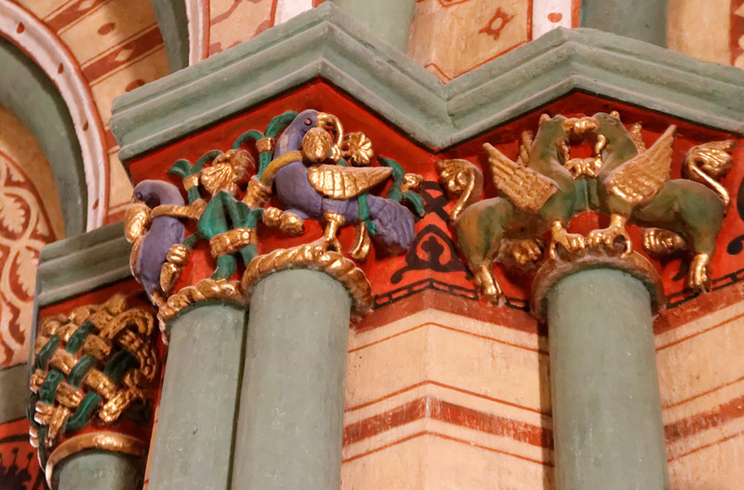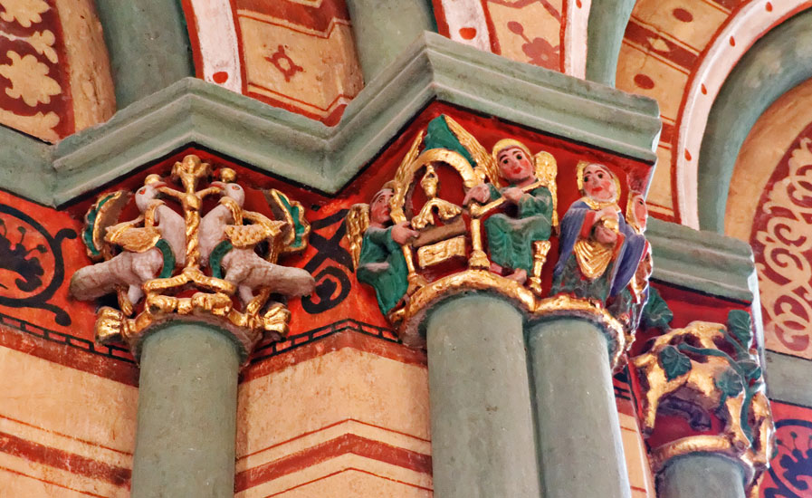 Au milieu, des religieuses suivent 2 anges portant un reliquaire(?). A gauche, 2 colombes.