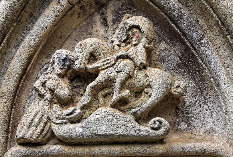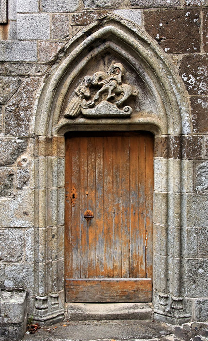Le tympan représente Saint Michel terrassant un dragon qu'une femme tient en laisse.