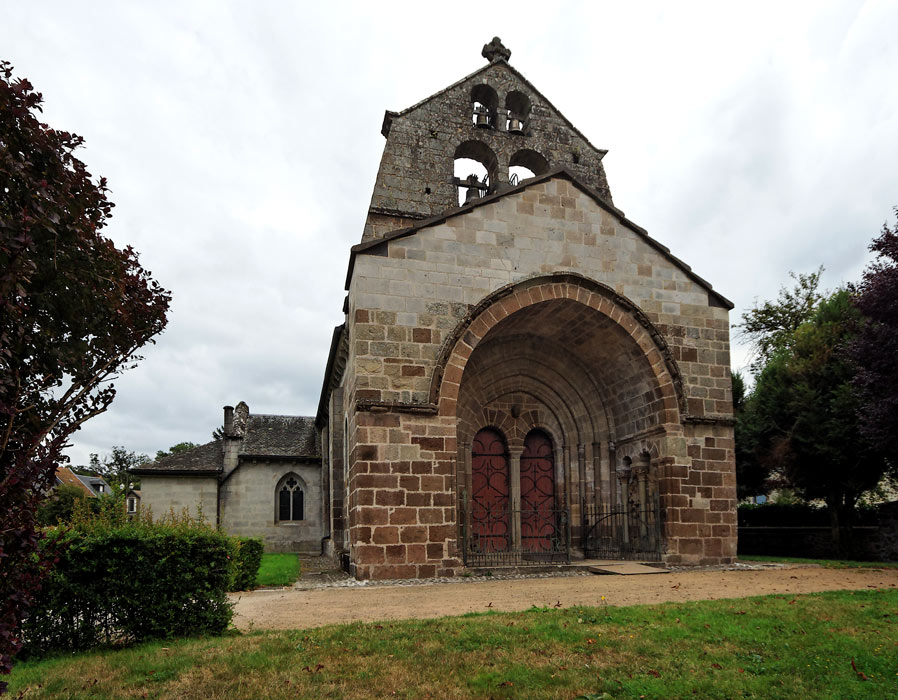 Les porches sont fréquents en Haute Auvergne. Ici l'ouverture du porche est surmontée d'un arc sculptée d'un zodiaque. Les 2 côtés du porche abrite des panneaux sculptés représentant l'Annonciation et Daniel dans la fosse aux lions. La porte présente de belles pentures : elle est surmontée d'une tête de Salguebrou.