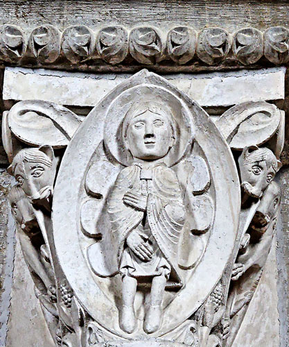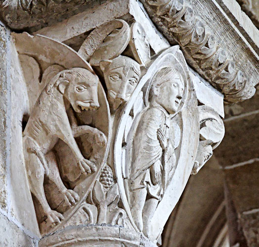Daniel, représenté dans une mandorle, est au milieu des lions qui ne lui font aucun mal.