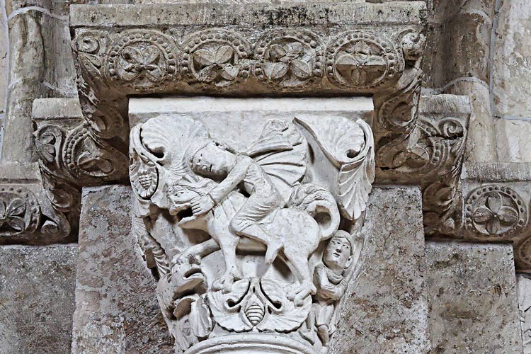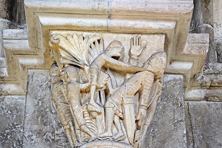 A gauche, David de dos actionne sa fronde contre Goliath. Sur la face centrale, David coupe la tête de Goliath après l'avoir assommé.