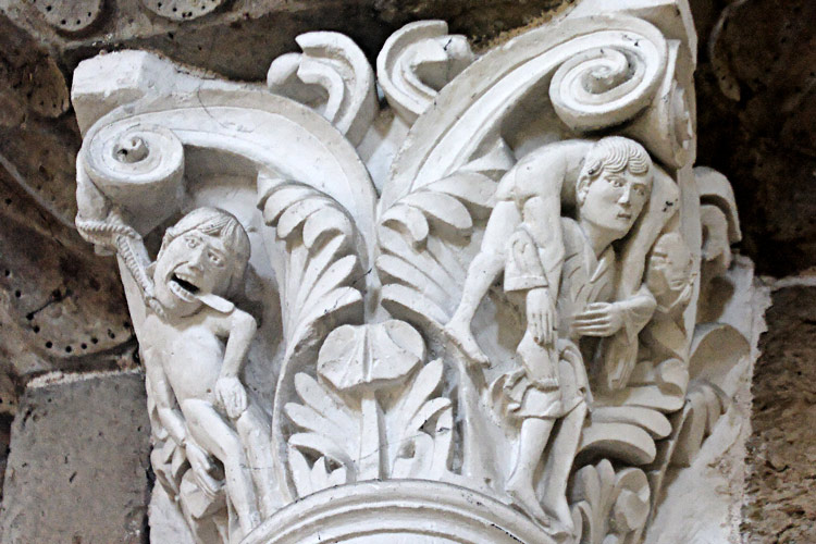 Chapiteau de la nef (2ème moitié du 12ème siècle), 2ème pile côté Nord, parties hautes: Hérode et Hérodiade (Hérodiade demande à son mari la tête de Saint Jean-Baptiste). Basilique Sainte-Marie-Madeleine de Vézelay