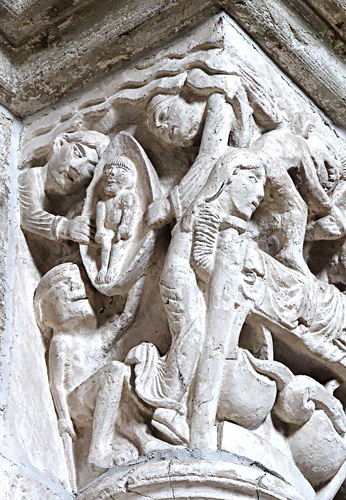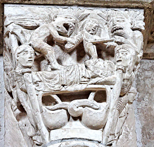 A gauche, l'âme de Lazare, représentée dans une mandorle, synonyme de sainteté, est emportée au paradis par des anges. A droite, l'âme du mauvais riche, qui avait refusé de le servir est promise aux tourments de l'enfer.