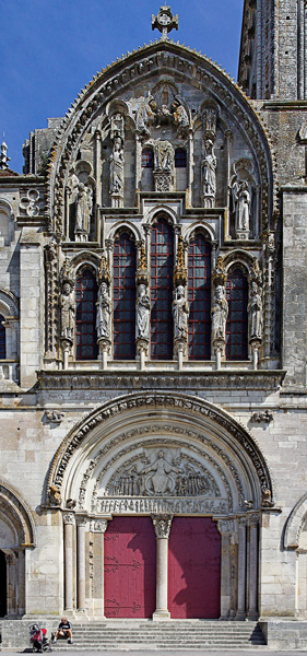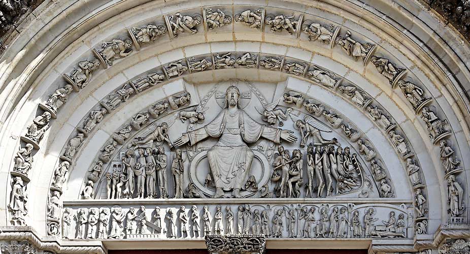 Le tympan extérieur du XIXème siècle représente le Jugement dernier. A la gauche du grand Christ, la pesée des âmes et les damnés. A sa droite, les élus. Le linteau est sculpté de scènes de la vie de Marie-Madeleine.