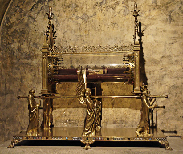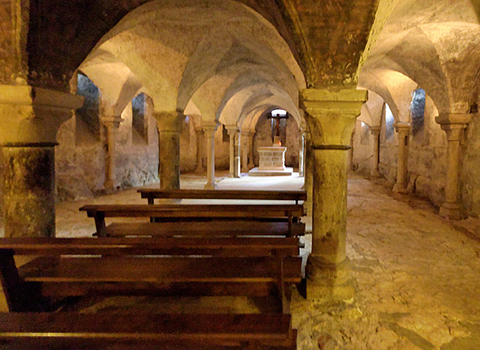 La crypte est la partie la plus ancienne de la basilique, remontant à l'époque carolingienne, mais ayant subi de nombreuses modifications. Longue de 19 métres, elle comprend 7 travées. La voûte est supportée par 12 colonnes de grosseurs inégales.