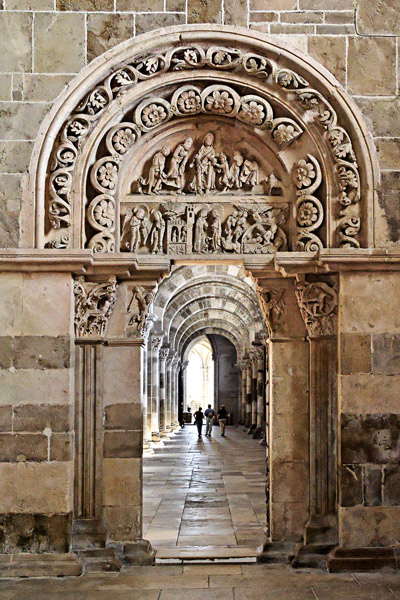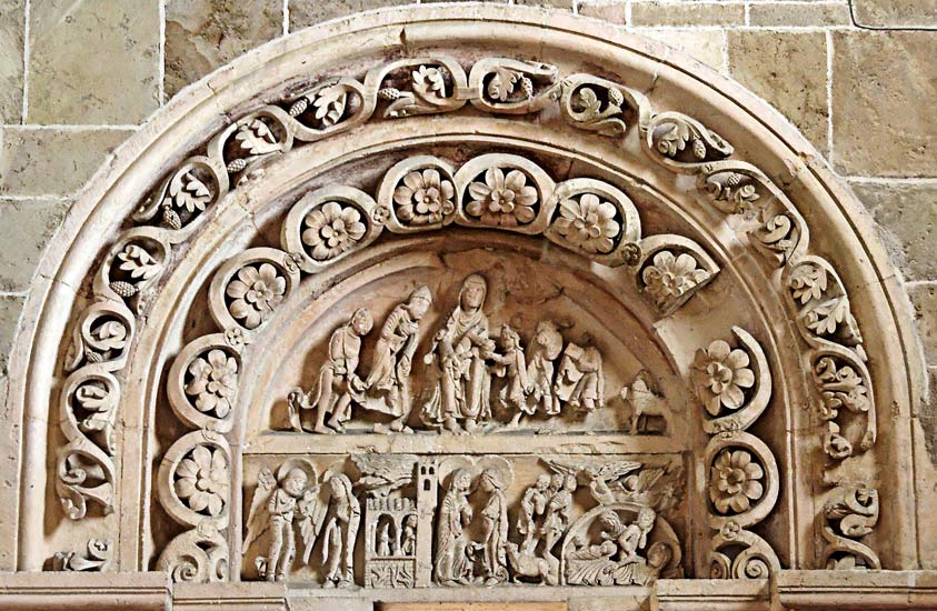 Le tympan sud et l'enfilade des arcs du collatéral sud. Les sculptures concernent des scènes de la Nativité. Cliquez ici pour voir le tympan en plein écran. |