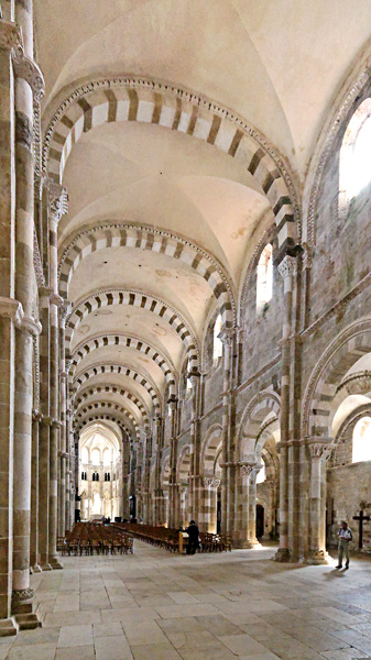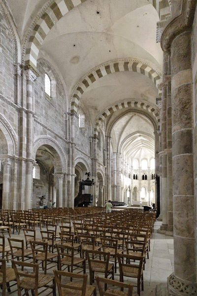 Vue depuis l'entrée, la nef apparaît comme un long vaisseau de pierre où, malgré les ouvertures sur les côtés, le choeur est un véritable puits de lumière. Sa longueur est de 62,50 mètres et sa hauteur de 18,55 mètres. Avec les collatéraux, la largeur totale est de 23 mètres. Elle comprend 10 travées. Les chapiteaux sculptés sont répartis sur deux étages : 3 chapiteaux en bas ( à environ 5 m) et un chapiteau engagé à 13 mètres de hauteur. Les arcs doubleaux en plein cintre sont polychromés. La stabilité de l'ensemble a été consolidée dans un premier temps par des tirants en fer en travers du vaisseau central. Jugés disgracieux, ils furent supprimés, mais des désordres apparaissant, il fallut renforcer la nef par des arcs boutants extèrieurs. Ainsi la poussée est transmise directement dans les piles cruciformes flanquées de 4 colonnes.