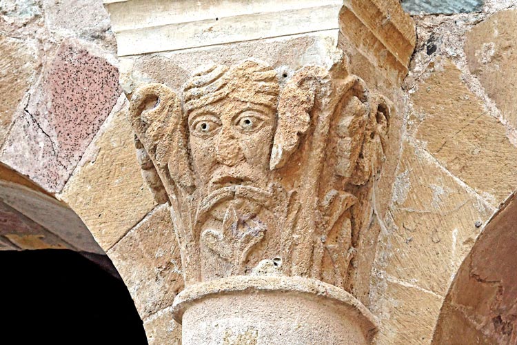 Les arcades de l'aile ouest subsistant du cloître. A droite, en bas, l'enfeu de Begon qui est installé le long du mur de l'église sous une petite arcade, entre deux contreforts.