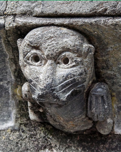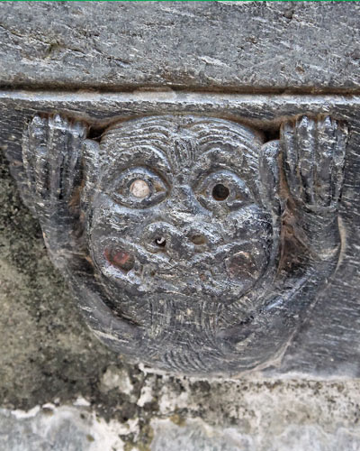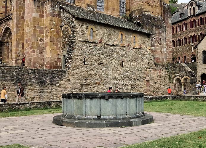 Le bassin en serpentine du cloître est dépourvu de sa vasque. Il a été remonté au moment de la restauration du cloître. De nouveaux éléments ont dû être créés. Cette pierre provenait d'une carrière située à une vingtaine de kilomètres de Conques. Elle a été sculptée de nombreux personnages. A droite de la photo, les deux petites arcatures subsistant du passage entre la galerie Est du cloître et la salle capitulaire