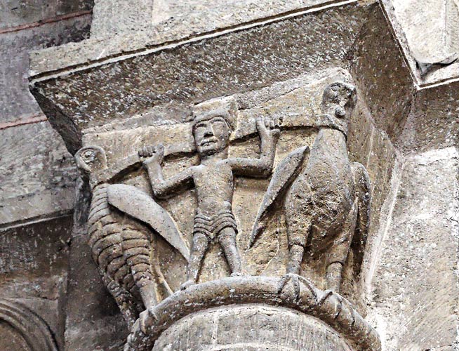 Un autre chapiteau parmi les plus anciens : représenterait-il l'ascension d'Alexandre le Grand enlevé par deux aigles ? (art-roman.net)