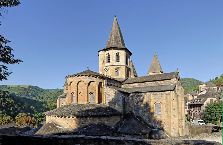 Le chevet le matin vu de l'est. Il présente un étagement pyramidal avec sept chapelles rayonnantes à la base : quatre pour le transept et trois autour du déambulatoire. Le toit de ce dernier est à peine visible entre les couvertures des chapelles. Puis vient le toit du passage aveugle qui permet de relier les deux côtés des tribunes. Enfin pour couronner le tout, le toit en faible pente de la voûte en cul-de-four. Le transept gauche et une partie du transept droit sont visibles. A leur intersection, se détache la tour de croisée.
