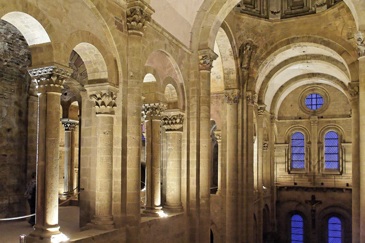 Le déambulatoire est doublé à l'étage par les tribunes et un passage qui contourne le choeur. Ces tribunes jouaient peut-être un rôle liturgique en période d'affluence. Elles s'ouvrent sur la nef par des baies géminées soutenues au centre par des colonnettes doubles. Chaque colonne ou demi-colonne est équipée d'un chapiteau sculpté. Ces chapiteaux sont pour la plupart d'inspiration corinthienne et forment une véritable forêt. Parmi eux, une douzaine sont historiés. Le soir, les vitraux dessinés par Soulages complétent la vision saisissante de cette forêt de pierre.