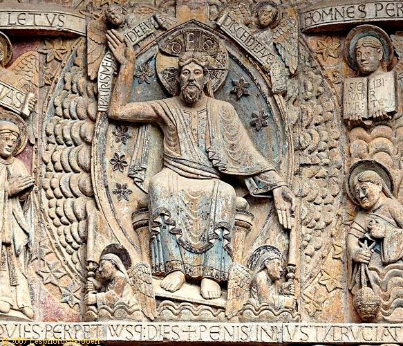 Au-dessus du Christ , se trouve la Croix de son martyre. Dans les cieux, le soleil et la lune sont représentés. Les bandeaux explicitent la scène : "Ce signe de Croix sera dans le ciel lorsque le seigneur viendra pour juger". (E. Vergnolle, 2005) |