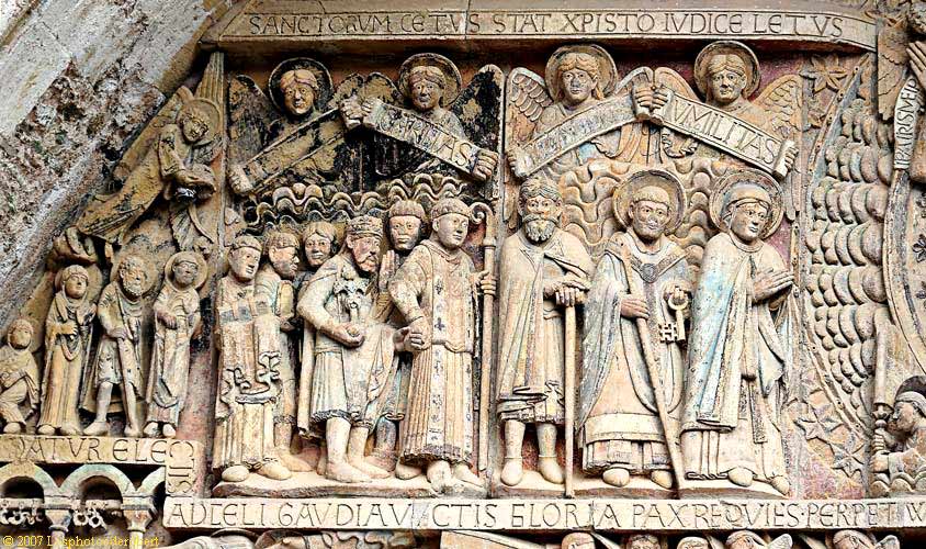 Le cortège des élus est conduit par la Vierge Marie suivie de Saint Pierre. A leur suite, trois personnages dont le destin est lié à Conques. Le dernier mène par la main un souverain à la barbe fleurie, sans doute Charlemagne que les Conquois ont voulu honorer. Les personnages ont des tailles décroissantes, créant ainsi un effet de perspective. Au-dessus des élus, des anges tiennent des inscriptions rappelant les quatre vertus : Foi, Charité, Constance, Humilité. |