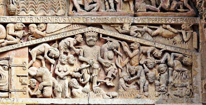 La partie supérieure de l'enfer est divisée en deux registres. En bas, à gauche, un roi découronné s'étonne de ne pas être parmi les élus qu'il montre du doigt. A droite, des démons dépècent un homme. Au-dessus, un faux monnayeur , reconnaissable à son poinçon, est contraint d'avaler du métal fondu. En haut, à gauche, on peut voir un mauvais moine, crosse à terre. |