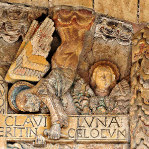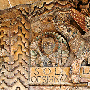 Les représentations du soleil et de la lune sont là pour affirmer que Le Christ régne non seulement sur la terre mais aussi sur les astres. Dans d'autres églises, c'est la présence des signes du zodiaque comme à Vézelay ou à Issoire qui exprimera par l'image ce concept. |