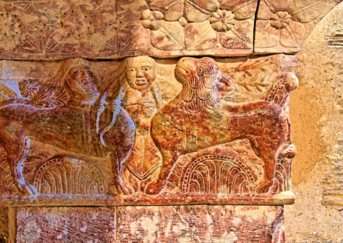 | Le centaure a déjà transpercé le cerf de ses traits. Le cerf à la haute ramure porte la tête en arrière. L'homme assiste impuissant au sacrifice. Pour J. Reynal, cette sculpture du meurtre du cerf est à mettre en rapport avec le sacrifice du Christ (cf. la page biblio). |