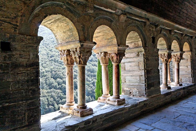 Venant de la nef, telle apparaît la galerie. En été, compte-tenu de la hauteur du soleil, la galerie reste dans l'ombre, offrant un havre de fraîcheur. Les motifs des chapiteaux sont directement inspirés des sculptures de l'Abbaye de Cuxa. Le monde oriental a fortement marqué de son influence les représentations au Moyen Âge. C'est également dans l'Antiquité et dans la Bible que les sculpteurs ont puisé leurs inspirations. Ici les sculpteurs ont utilisé largement le thème du lion. Le lion est le roi des animaux. Ce statut détermine la place ambivalente du lion, à la fois image du Diable et symbole du Christ. Comme mangeur d'hommes, il signifie la mort. |