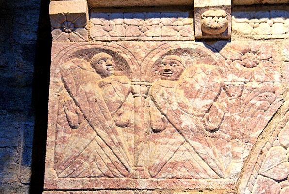 Les séraphins aux quatre ailes invitent à la prière. La sculpture est traitée ici en réserve. |