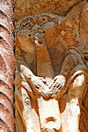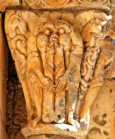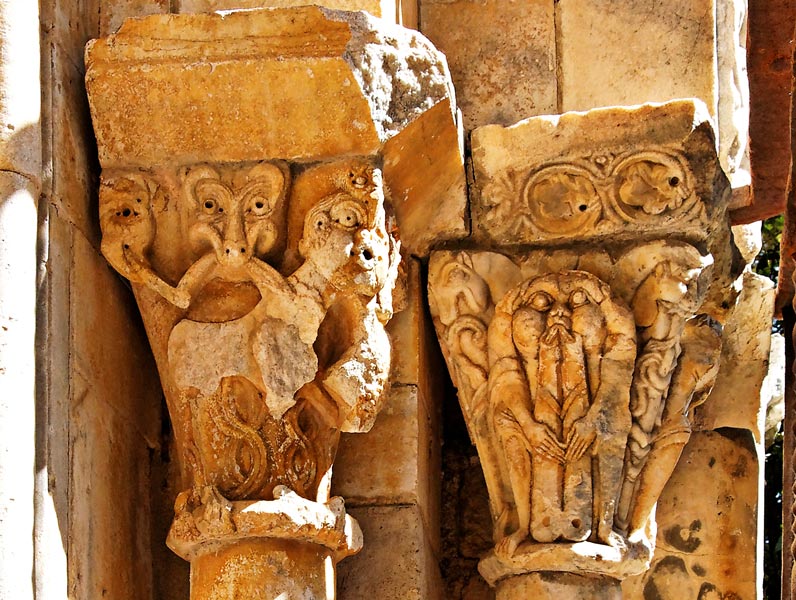 Ce sont les deux chapiteaux de droite du portail. Le sonneur de trompe est caractéristique du style du Maître de Cabestany. Cependant certaines différences font que les spécialistes pensent qu'il faut plutôt les attribuer à des sculpteurs s'inspirant de son style.