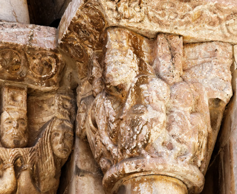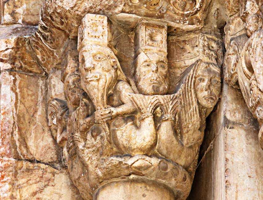 Ce chapiteau du côté droit est bien conservé. Des sirènes barbues ou non occupent les angles. Des têtes humaines ornent les dés saillants. Par comparaison des styles, la sculpture de ces chapiteaux peut être datée du dernier tiers du XIIème siècle.